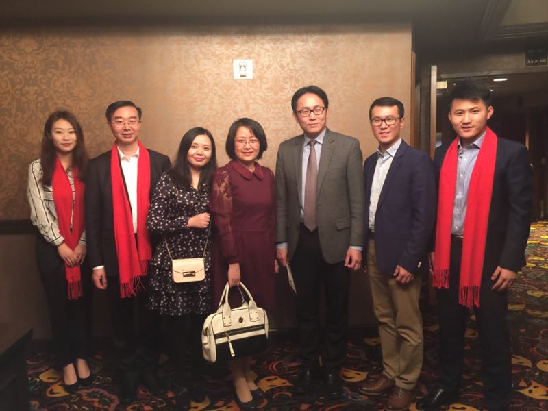 (左二愛(ài)濤集團(tuán)董事長(zhǎng)張發(fā)松,左三內(nèi)華達(dá)州華人協(xié)會(huì)副會(huì)長(zhǎng)王若梅,左四文化廳辦公室副主任曹蕾,右三文化部外聯(lián)局美大處副處長(zhǎng)金梁,右二文化廳對(duì)外文化交流處主任科員俞驍窈)