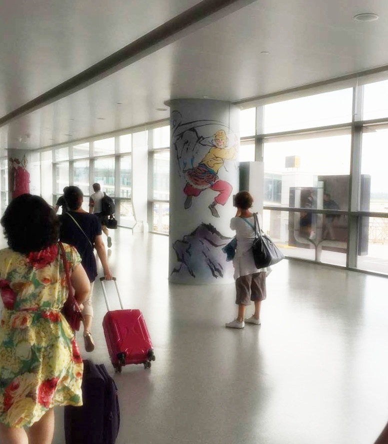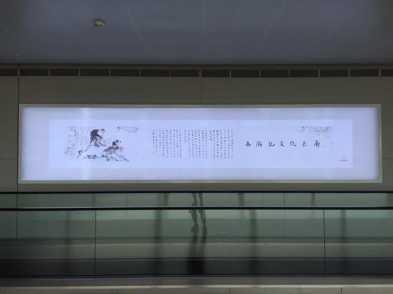 下了飛機(jī)疲憊的倦容適合欣賞一些美景,隨著輕輕的步調(diào),環(huán)顧四周,灰白色的墻上已換上新裝,沒(méi)有半點(diǎn)亂花漸欲迷人眼的浮躁感,不驕不躁的水墨情呈現(xiàn)給燈箱是再合適不過(guò)的,整個(gè)T2航站樓的長(zhǎng)廊儼然開(kāi)拓了一副新天地,斜陽(yáng)西照,深色的柱子上一幅幅西游記的經(jīng)典場(chǎng)景回放著映入眼簾,穿過(guò)獨(dú)具特色的長(zhǎng)廊,陽(yáng)光透過(guò)玻璃墻,照射在灰色的地面上?;趾氪髿獾拈L(zhǎng)廊里,有一種內(nèi)斂含蓄的文化底蘊(yùn)在涌動(dòng),長(zhǎng)廊如紙,柱體如虹,旅客的性情、思緒,融入在造型、筆墨、意蘊(yùn)之中,整個(gè)長(zhǎng)廊里流動(dòng)著平實(shí)敦厚,溫潤(rùn)超逸的謙謙之音,旅客亦喜焉,似樂(lè)也。