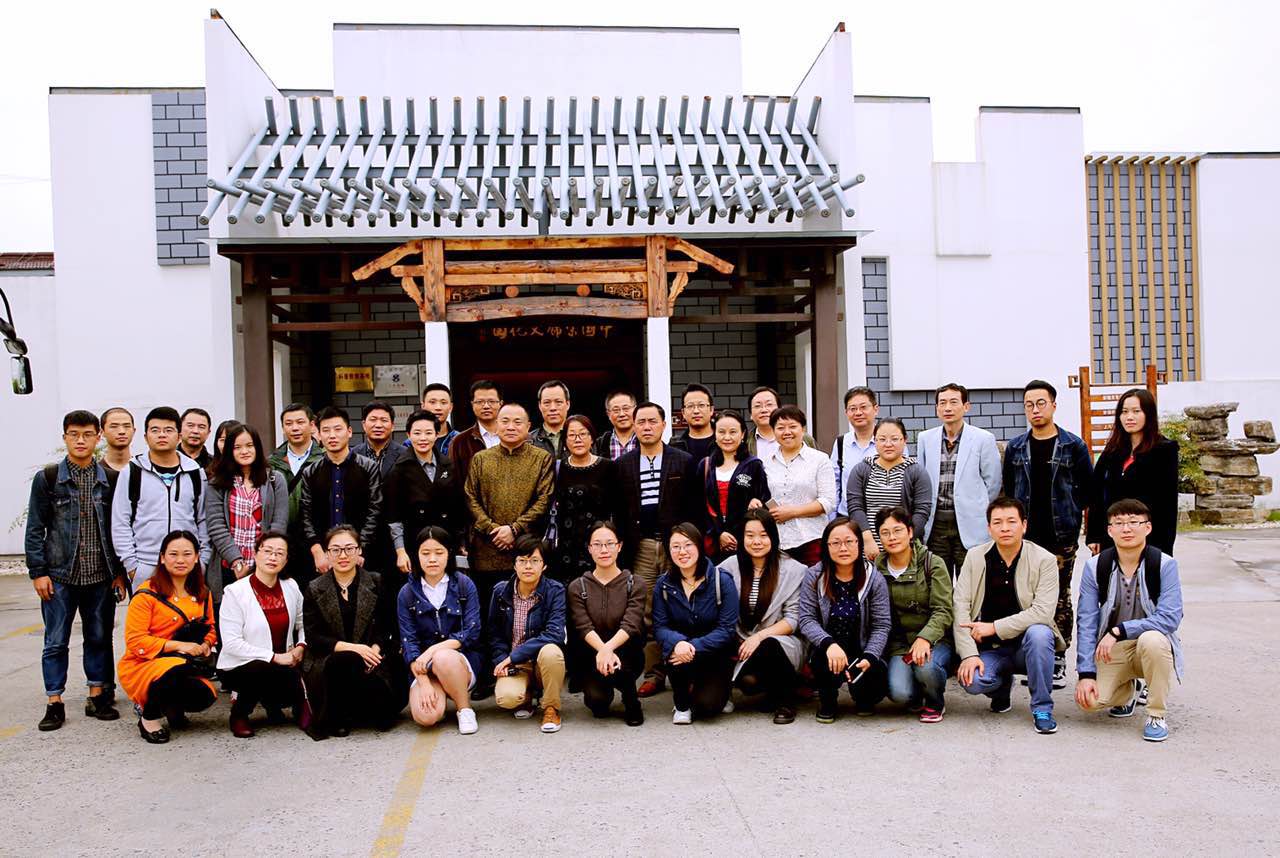 鼎盛絲綢董事長(zhǎng)吳建華與蘇豪傳媒副總經(jīng)理單鳳艷率參展團(tuán)在中國(guó)宋錦文化園前合影