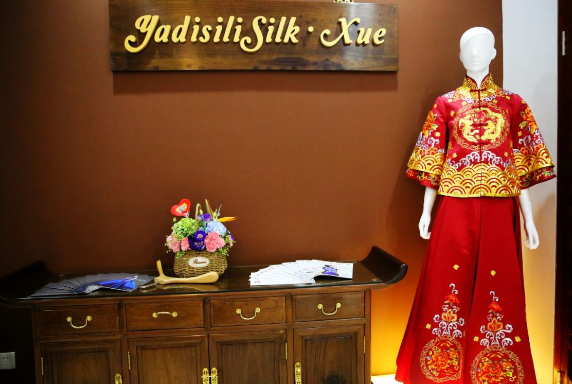 “YADISILISILK·XUE”為蘇州市歐星絲綢紡織有限公司旗下高定品牌,金雞湖店陳列了中式嫁衣、禮服、婚紗等高級定制華服和成衣系列,當中融入了非常多的傳統(tǒng)文化,包括蘇繡、盤金繡、手繪等。今后在這里,客戶可以體驗到純粹的手工制衣,享受量體裁衣的專屬性。