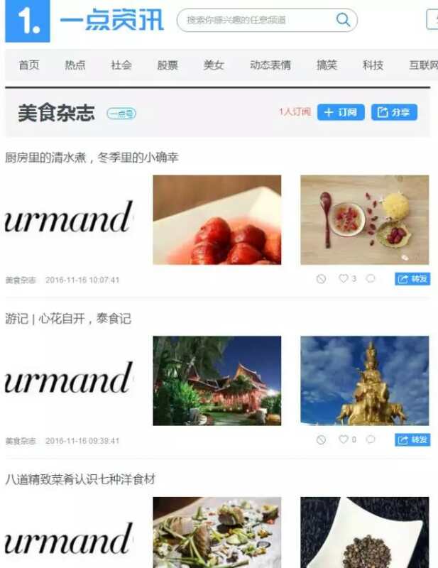 《美食》雜志微信公眾號自開通以來,一直傳遞餐飲熱門信息,分享優(yōu)質(zhì)美食文章,兼顧專業(yè)與娛樂。因《美食》雜志微信公眾號注重內(nèi)容質(zhì)量,閱讀量可觀,“一點(diǎn)資訊”和“今日頭條”信息分發(fā)平臺向《美食》雜志微信公眾號發(fā)來入駐邀請函。